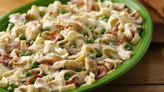 - For a REALLY FAST version, buy precooked chicken, packaged bacon pieces from the salad dressing section, a can of drained veggies, Alfredo sauce in a jar and shredded white cheddar or Italian cheese blend. Put all those ingredients in a large pan on med-high heat to get it hot, then add your noodles...all done. It won't be nearly as good but it will be prepared in the amount of time it takes you to cook the pasta.